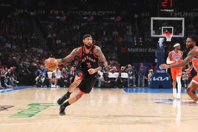 中場休息回來,雷霆本場第二次單節得分30+,且限制猛龍連續三節得分不足30分。雷霆繼續被拉開52-59落后差距,維金斯與杰林各中一記三分追到差1分,猛龍重新擴大4分優勢。雷霆追回3分,沃爾特三分命中,亞歷山大持續得分引領雷霆逐步75-70反超5分,迪克三分回敬。雙方繼續緊咬比分纏斗,雷霆單節31-25凈勝6分,三節結束雷霆81-79反超猛龍。前三節比賽,雷霆三分命中數10-9領先,亞歷山大10中7(第三節5中5得到12分)得到21分5助攻、多爾特17+6與維金斯11分;巴雷特14分與英格拉姆11分,引領4人得分上雙。