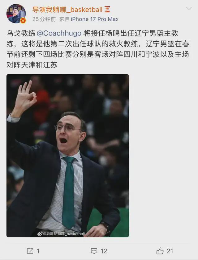 據報道,外教烏戈-洛佩茲將接替楊鳴,成為遼寧男籃新任主教練。這是烏戈第二次出山救火,此前楊鳴因為家庭問題短暫離職,烏戈擔任了一段時間的主教練,效果非常好,年輕球員也得到了上場時間。