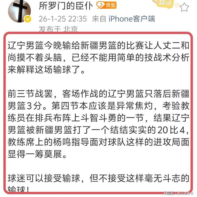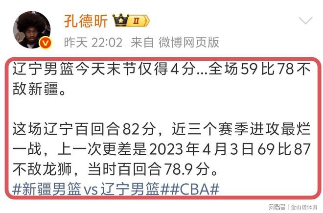 媒體人孔德昕社媒發文點評“遼寧男籃今天末節僅得4分...全場59比78不敵新疆。這場遼寧百回合82分,近三個賽季進攻最爛一戰,上一次更差是2023年4月3日69比87不敵龍獅,當時百回合78.9分。”。