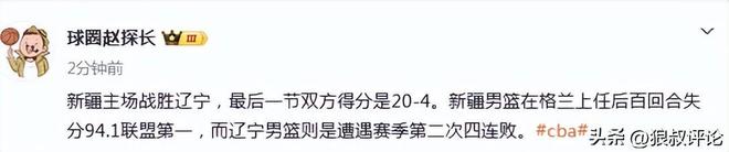 新疆主場戰勝遼寧,最后一節雙方得分是20-4。新疆男籃在格蘭上任后百回合失分94.1聯盟第一,而遼寧男籃則是遭遇賽季第二次四連敗。