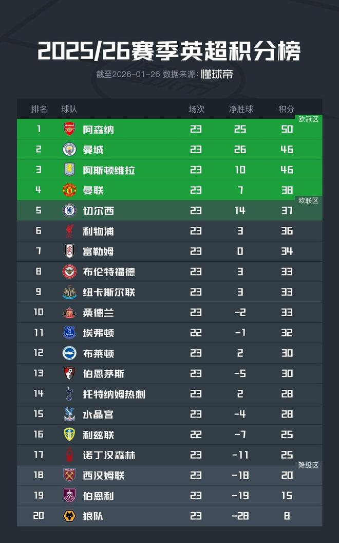 北京時間1月26日,2025/26賽季英超聯賽結束了第23輪的絕大部分比賽,積分榜的形勢也產生了進一步的變化。