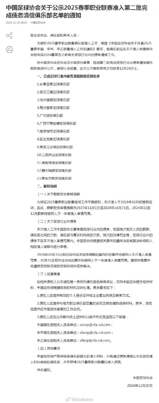 中國足協(xié)公示2025賽季職業(yè)聯(lián)賽準入第二批完成債務清償俱樂部名單,此前不在第一批名單里的長春亞泰、武漢三鎮(zhèn)、滄州雄獅、梅州客家、廣州、廣西平果哈嘹、南京城市、延邊龍鼎、黑龍江冰城、江西廬山、湖南湘濤、贛州瑞獅、泰安天貺全員上榜,相當于所有三級職業(yè)俱樂部都進行了完成債務清償?shù)墓尽????